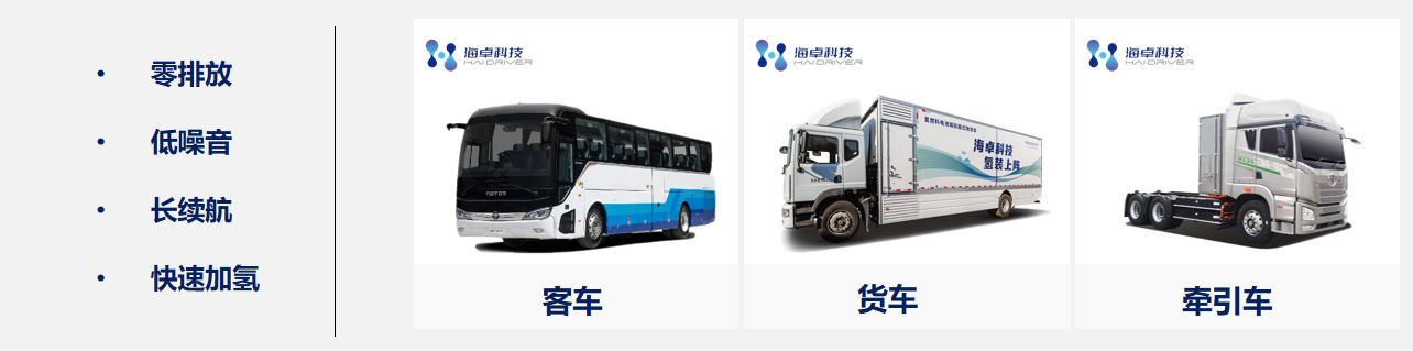 氫燃料電池車輛具有零排放的特點(diǎn),相比于純電,燃料電池技術(shù)具有長續(xù)航、動力足、高載重、加氫速度快等優(yōu)勢。我們致力于為交通領(lǐng)域提供可靠、高效的燃料電池解決方案。在車載應(yīng)用領(lǐng)域,已為700余輛燃料電池汽車提供動力支持,覆蓋物流車、自卸車、牽引車、公交車等多個車型,并在全國多地投入運(yùn)營。