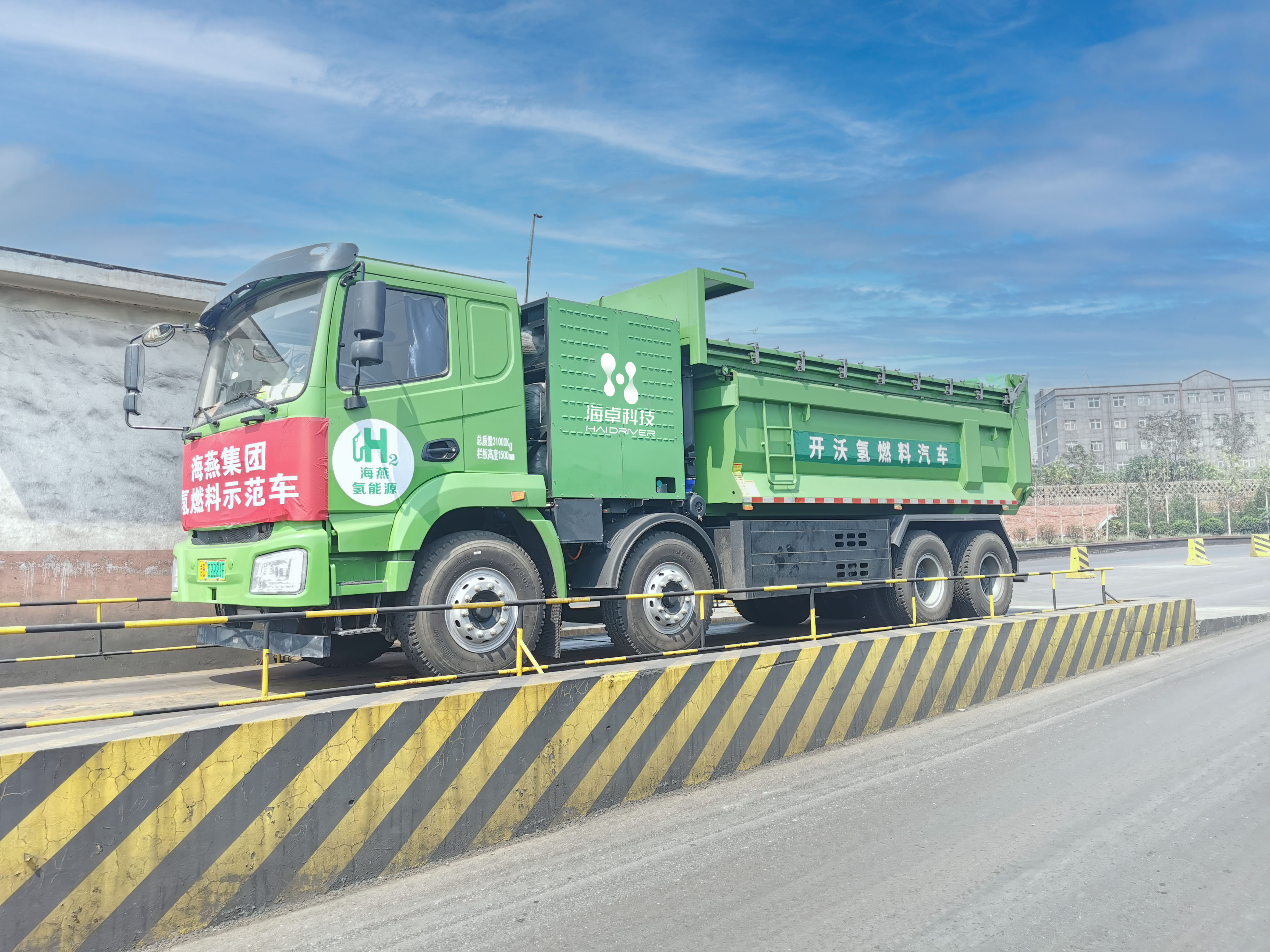 此次示范采用的是2臺(tái)開沃集團(tuán)所生產(chǎn)的氫能重卡自卸車,配套海卓科技110KW氫燃料電池發(fā)動(dòng)機(jī)系統(tǒng)。整車以氫氣作為動(dòng)力來源,經(jīng)燃料電池轉(zhuǎn)化,以電能驅(qū)動(dòng)運(yùn)行,唯一排放物為清潔水,真正實(shí)現(xiàn)零排放,零污染,該車具有動(dòng)力強(qiáng)勁、續(xù)航能力長(zhǎng)、加氫時(shí)間短等特點(diǎn),將應(yīng)用于海燕集團(tuán)內(nèi)部短導(dǎo)及龍鋼焦炭供應(yīng)運(yùn)輸。
