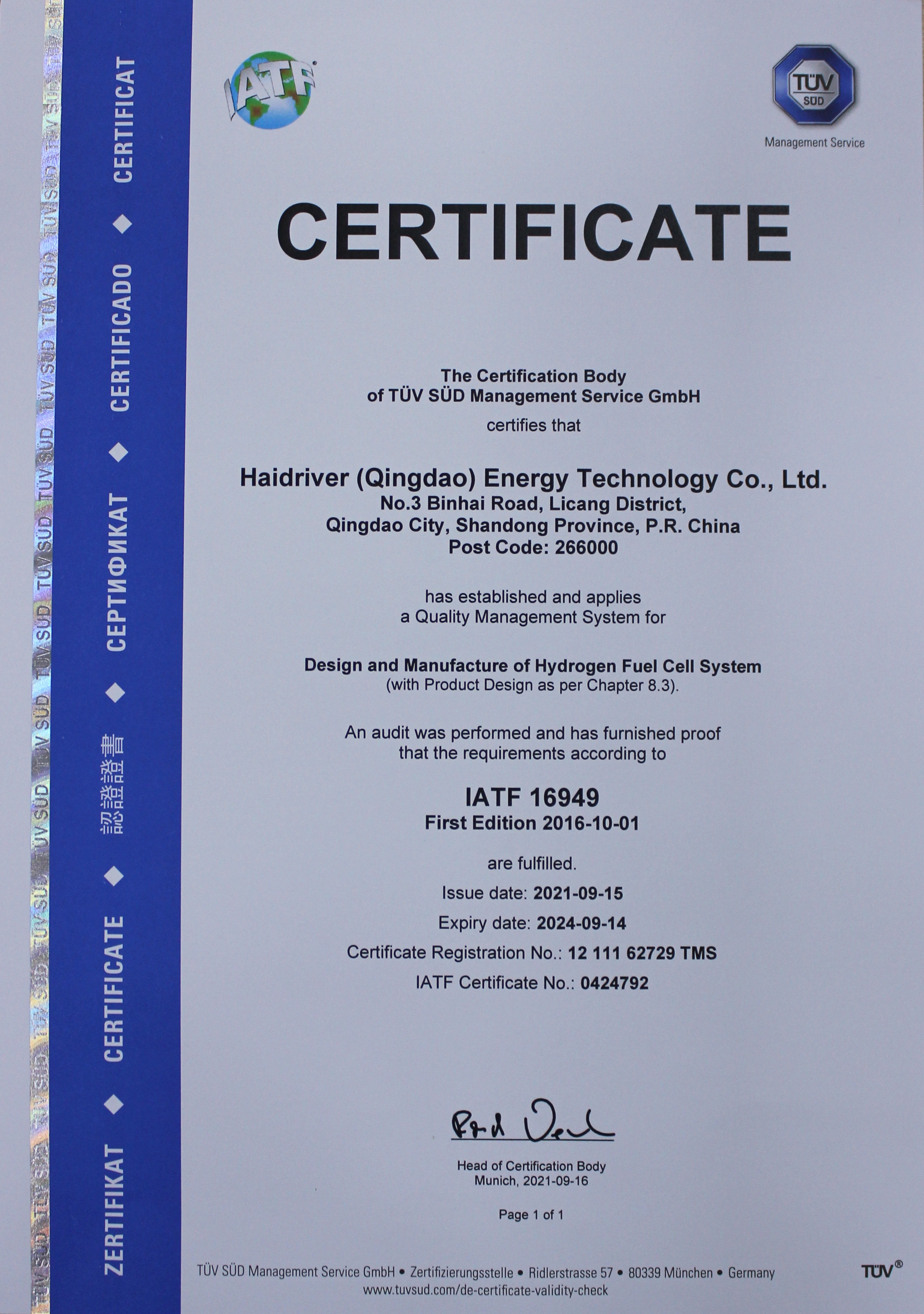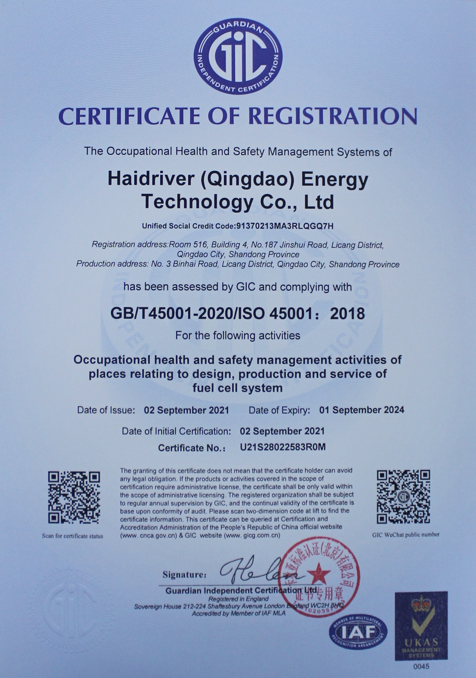 IATF16949: 2016 Quality Management System Certification; ISO14001: 2015 Environmental Management System Certification; ISO45001: 2018 Occupational Health and Safety Management System Certification.